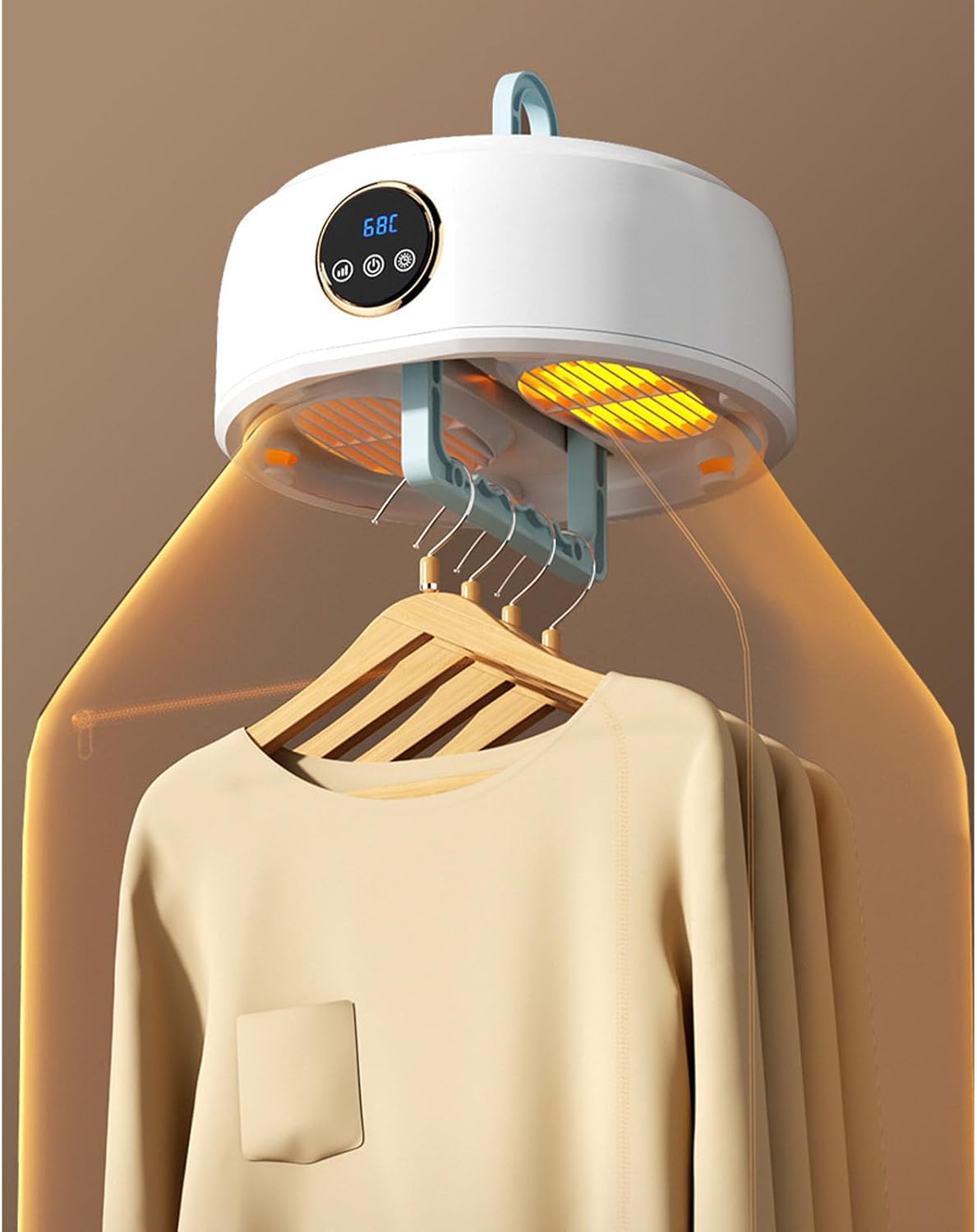 Es un sistema de secado compacto que utiliza tecnología de circulación de aire caliente para eliminar la humedad de la ropa rápidamente. Su diseño vertical y plegable permite colgarlo en cualquier lugar, siendo una alternativa ideal a las secadoras convencionales.